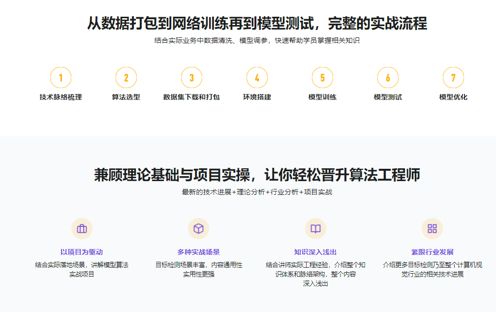课程从算法角度出发,对各个模型进行全面细致的讲解,并结合人脸检测、物体检测、行人车辆检测、文本检测等项目,熟悉算法工程师在工作中会接触到的数据打包、网络训练、测试等问题,一步步带大家了解和完成目标检测实战案例,尽快进入深度学习领域。