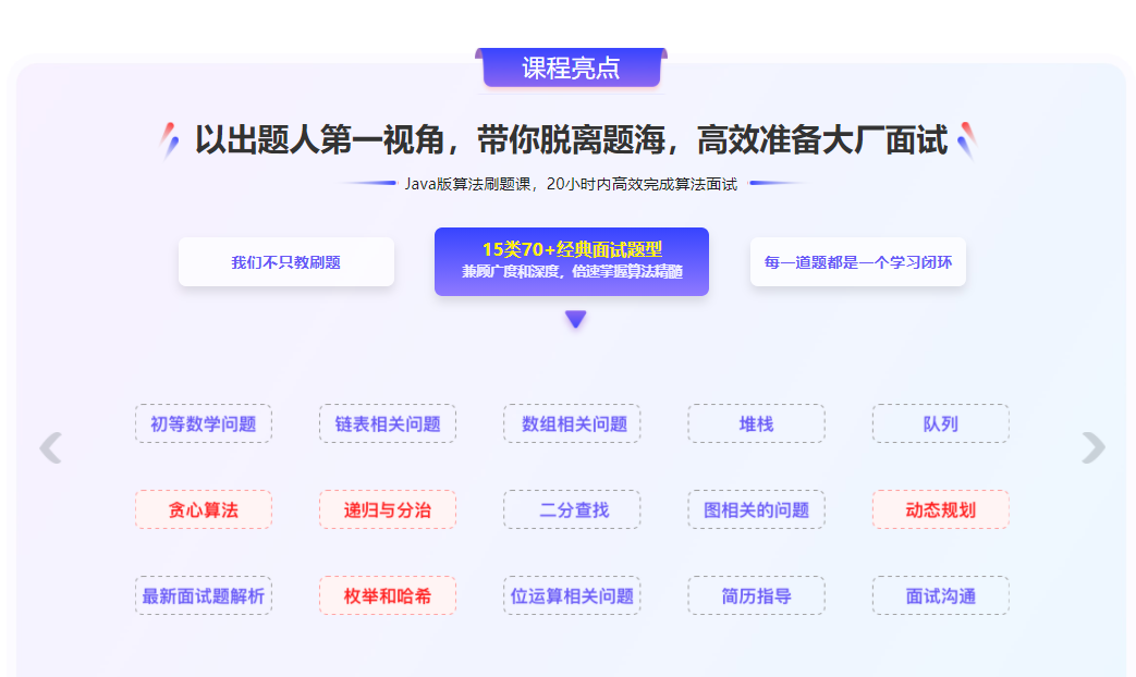 本套课程不讲算法基础知识,专攻算法题解。讲师作为诸多算法练习相关网站出题人,拥有多年出题及面试经验,将大厂主流经典的面试题全面归类梳理,带你掌握高效解题思路,摆脱题海,举一反三,只需20小时,完成面试准备。