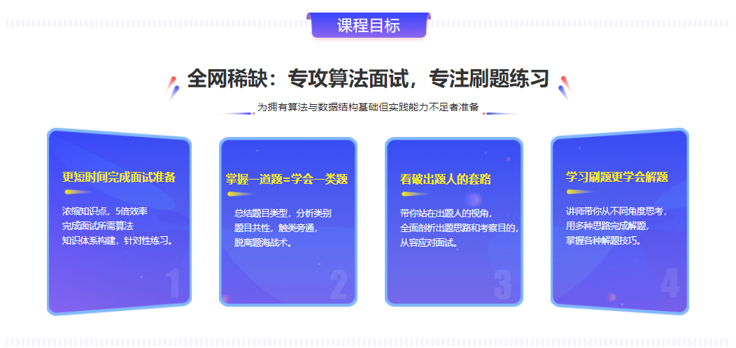 摆脱题海,高频经典题目归纳讲解;以练代学,短期高效完成面试准备