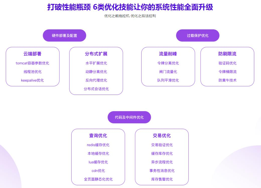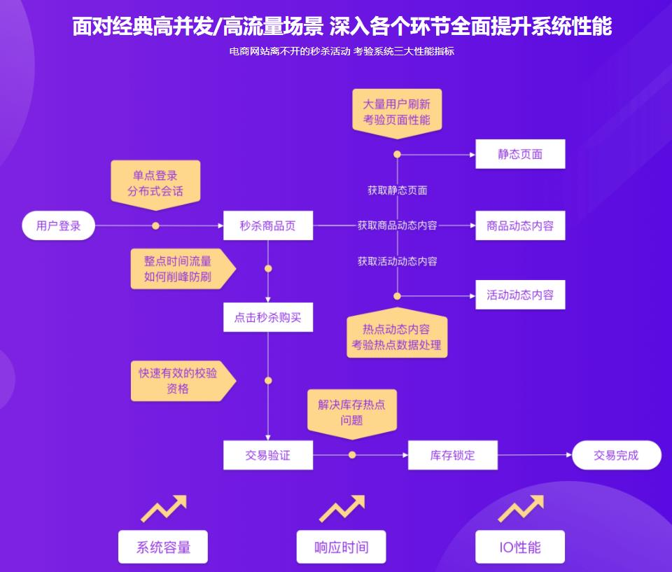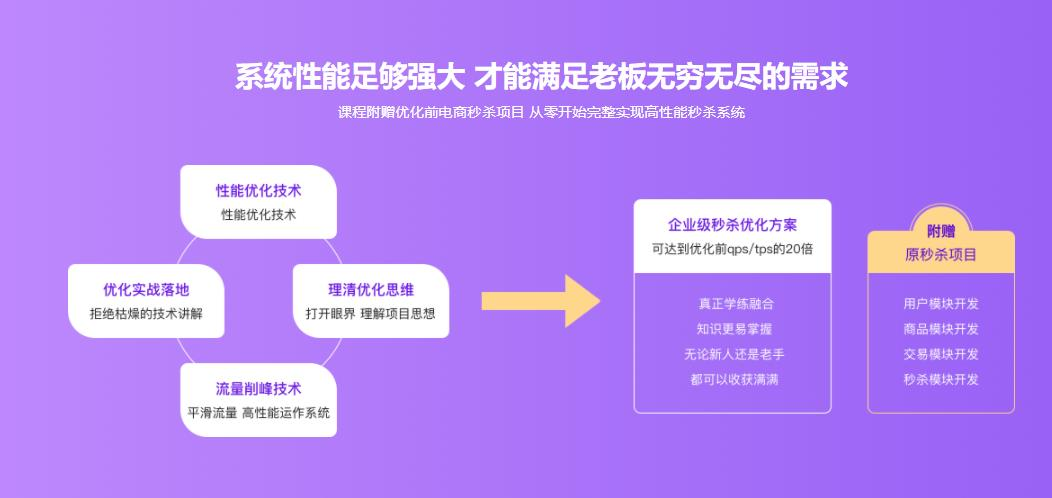 课程中借由“电商秒杀”案例,通过多种性能优化技术,总结了互联网项目中“秒杀”的经典性能优化方案技术,提供了统一的设计思维和思考方式,帮助同学们真正理解性能优化中每个技术的使用以及背后的原理。