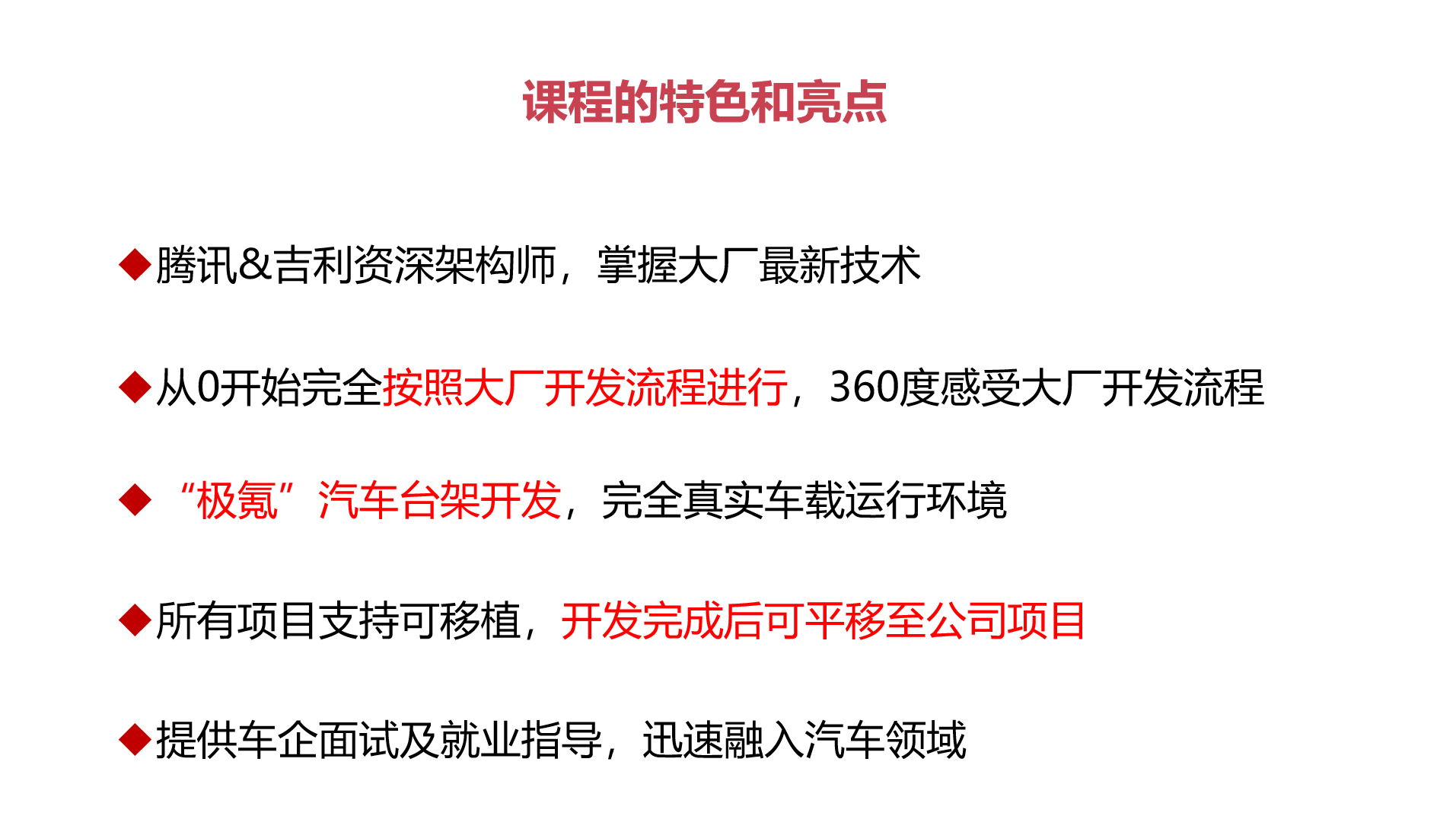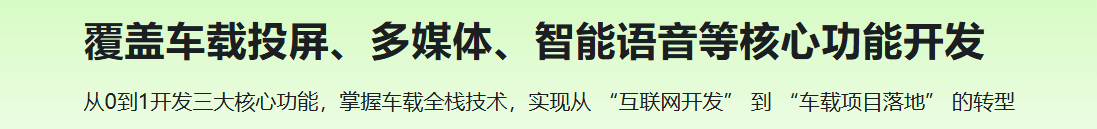 本课程通过手把手教学车载投屏、车载多媒体、智能语音等三大核心功能开发,帮你系统掌握车载 Android 架构、车载App迭代方式、复杂多进程媒体管理等关键技术,并驾驭智能座舱项目全流程。同时学会将互联网开发经验迁移至车载场景,解决跨领域适配难题。最终实现不切换技术栈,低成本转入火爆的新能源车载领域,快速构建车载开发技术护城河,实现职业赛道突破。
